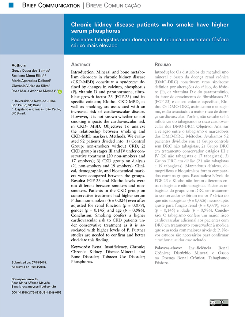DescargarChronic kidney disease patients who smoke have higher serum phosphorus. Santos GDD, Elias RM, Dalboni MA, Silva GVD, Moysés RMA. J Bras Nefrol. 2018 Dec 10. pii: S0101-28002018005043101.